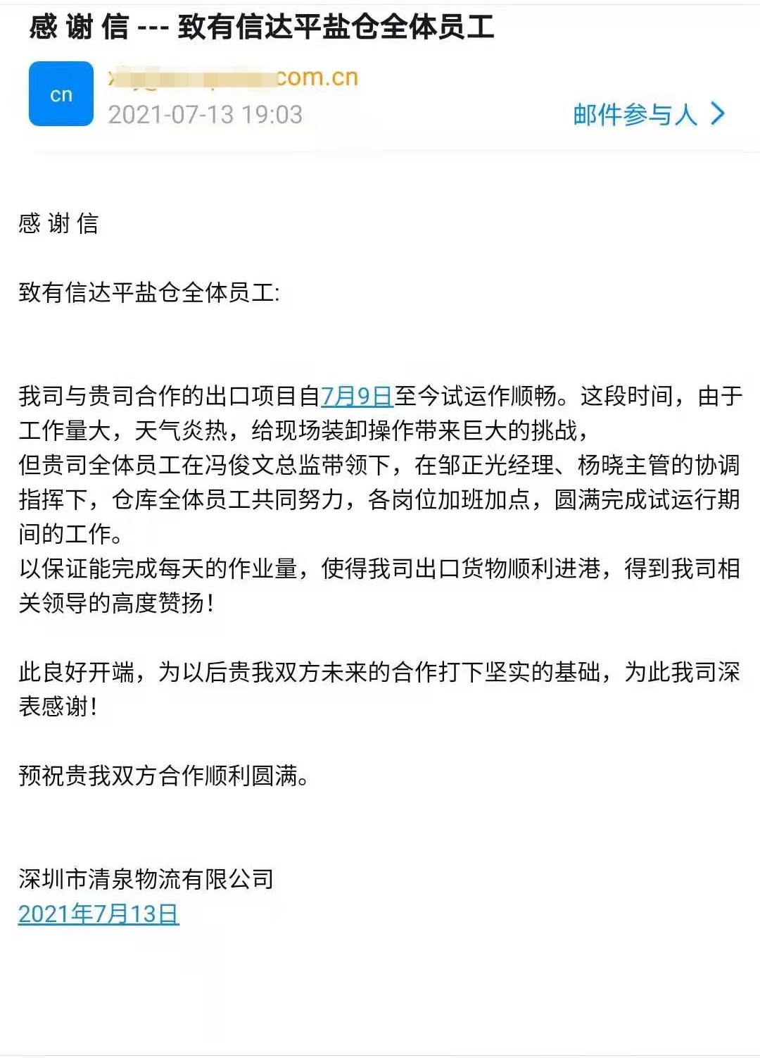 3133拉斯维加斯与深圳市清泉物流有限公司于7月9日开始项目试运行,3133拉斯维加斯小伙伴们秉持着企业使命为客户尽心尽力服务,高效完成作业,为合作伙伴解决难题!感谢合作伙伴的认可与肯定!同时预祝与清泉物流公司合作顺利圆满!