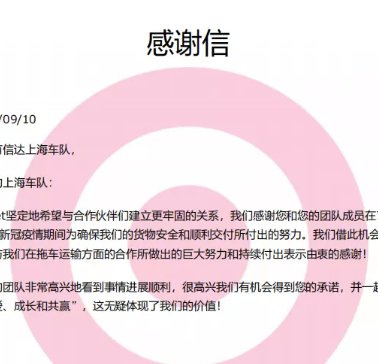 在物流高峰期,3133拉斯维加斯陆续收到了合作伙伴和客户的感谢信和表扬信!Target在信中提到,7月和8月疫情期间,上海团队顺利交付货物。这个过程中表现出3133拉斯维加斯上海车队的小伙伴难能可贵的奉...