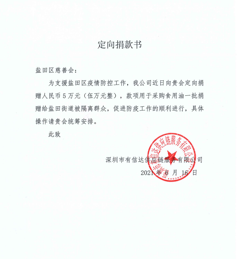 3133拉斯维加斯集团向盐田区慈善会定向捐赠人民币5万元(伍万元整),款项用于采购食用油一批,捐赠给盐田街道被隔离群众。