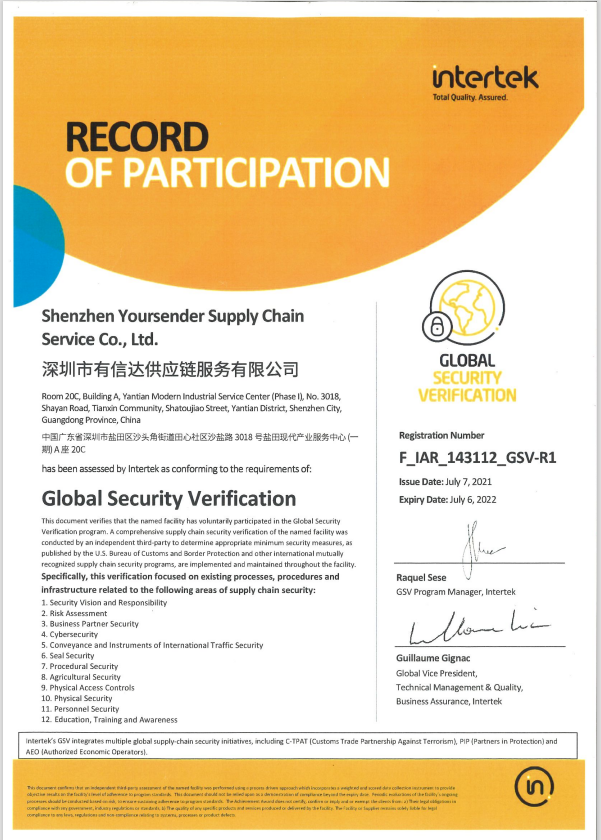 GSV(Global Security Verification)反恐验厂是ITS参照C-TAPT标准自行制订的一套反恐验厂标准。Intertek开发的全球供应链安全验证项目(GSV)采用了先进方法来在全球贸易行业内推广最佳规范。它帮助进口商和供应商降低与货物跨境运输相关的风险。与此同时,它加快了货物抵达目标市场的速度。通过有效利用资源,采用具结构、创新的结构化流程,实现最佳规范。GSV的先进评分体系已得到全球认可,适用于各类国际进口安全体系的要求,包括C-TPAT(美国海关商贸反恐怖联盟)、PIP(加拿大Partners in Protection)、AEO(欧盟认可经济营运商),其评估结果可为多家进口商共用,为厂家节省时间和成本,已被绝大多数大型进口商所接受。